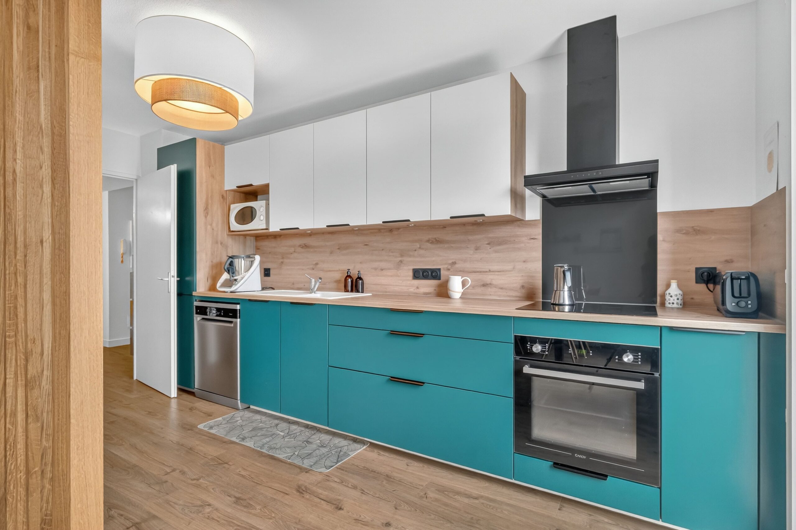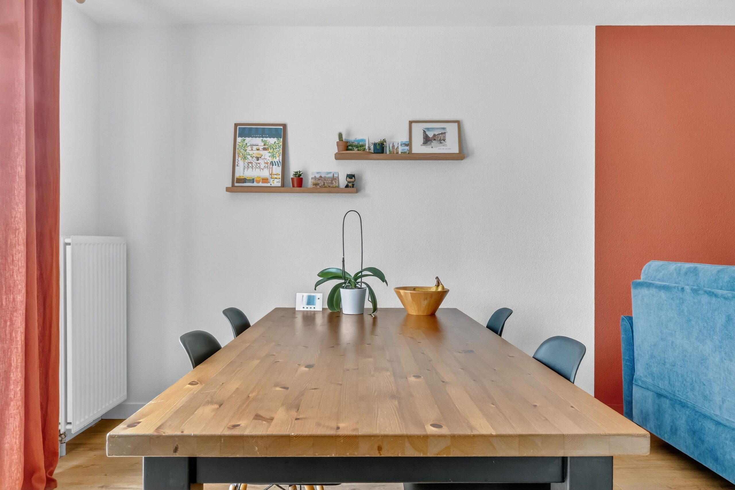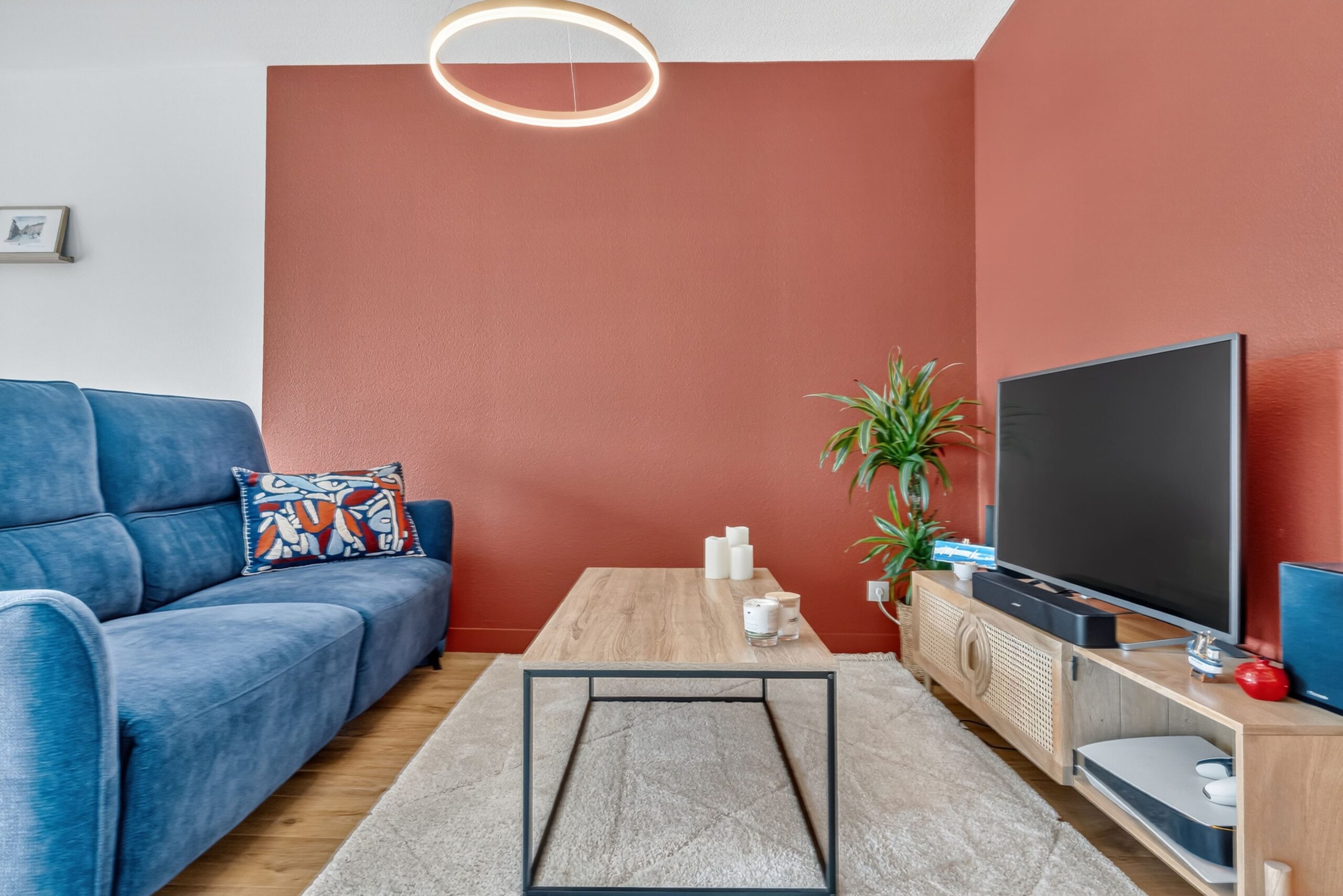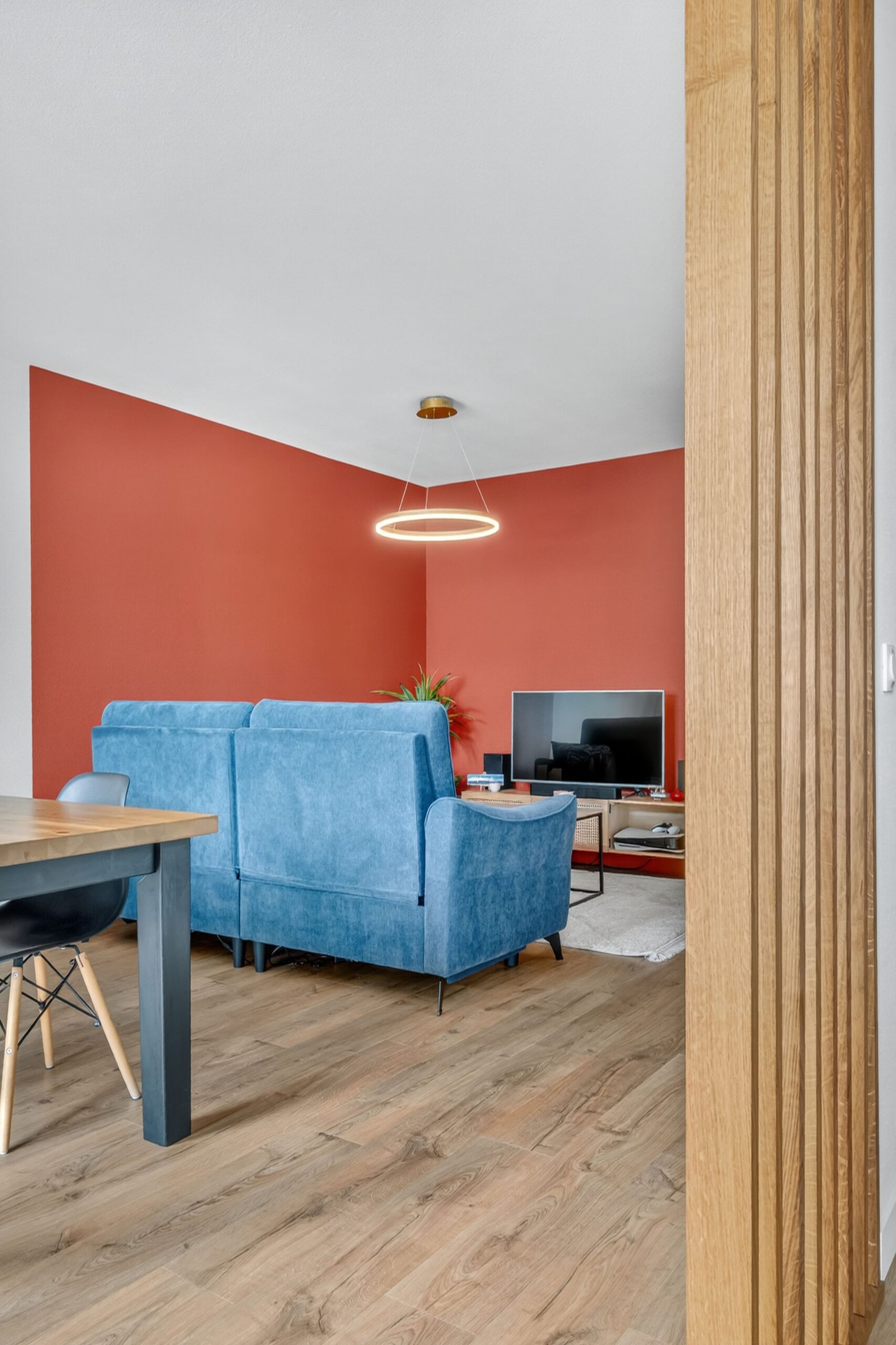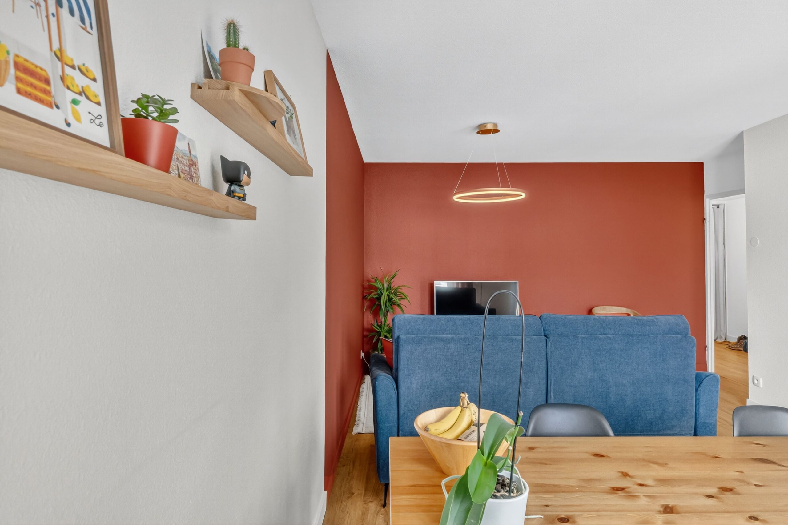 Ce projet a été mené entièrement à distance. Les clients venaient d’acheter un appartement et souhaitaient lui donner une atmosphère chaleureuse et colorée. Leurs teintes de prédilection étaient le terracotta et le vert foncé, qu’ils imaginaient associées à du bois et à des matières naturelles pour une décoration authentique.